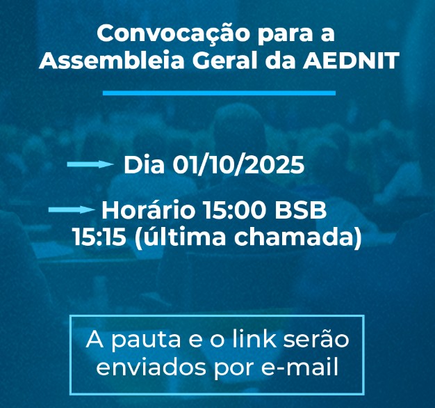 O PRESIDENTE DA ASSOCIAÇÃO NACIONAL DOS ENGENHEIROS E ANALISTAS EM INFRAESTRUTURA DE TRANSPORTES DO DNIT – AEDNIT, em conformidade com a previsão estatutária, notadamente aquela constante no artigo 30, convoca todos os associados para a Assembleia Geral Extraordinária – AGE-V (virtual) a ser realizada no dia 01/10/2025.